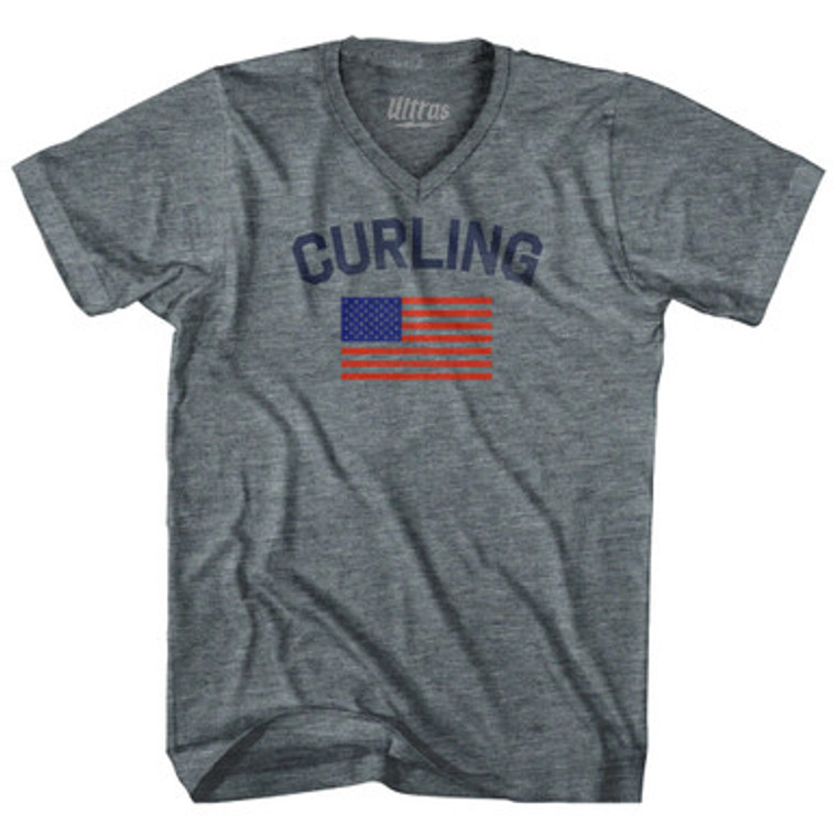 Curling USA Flag Tri-Blend V-neck Womens Junior Cut T-shirt - Athletic Grey